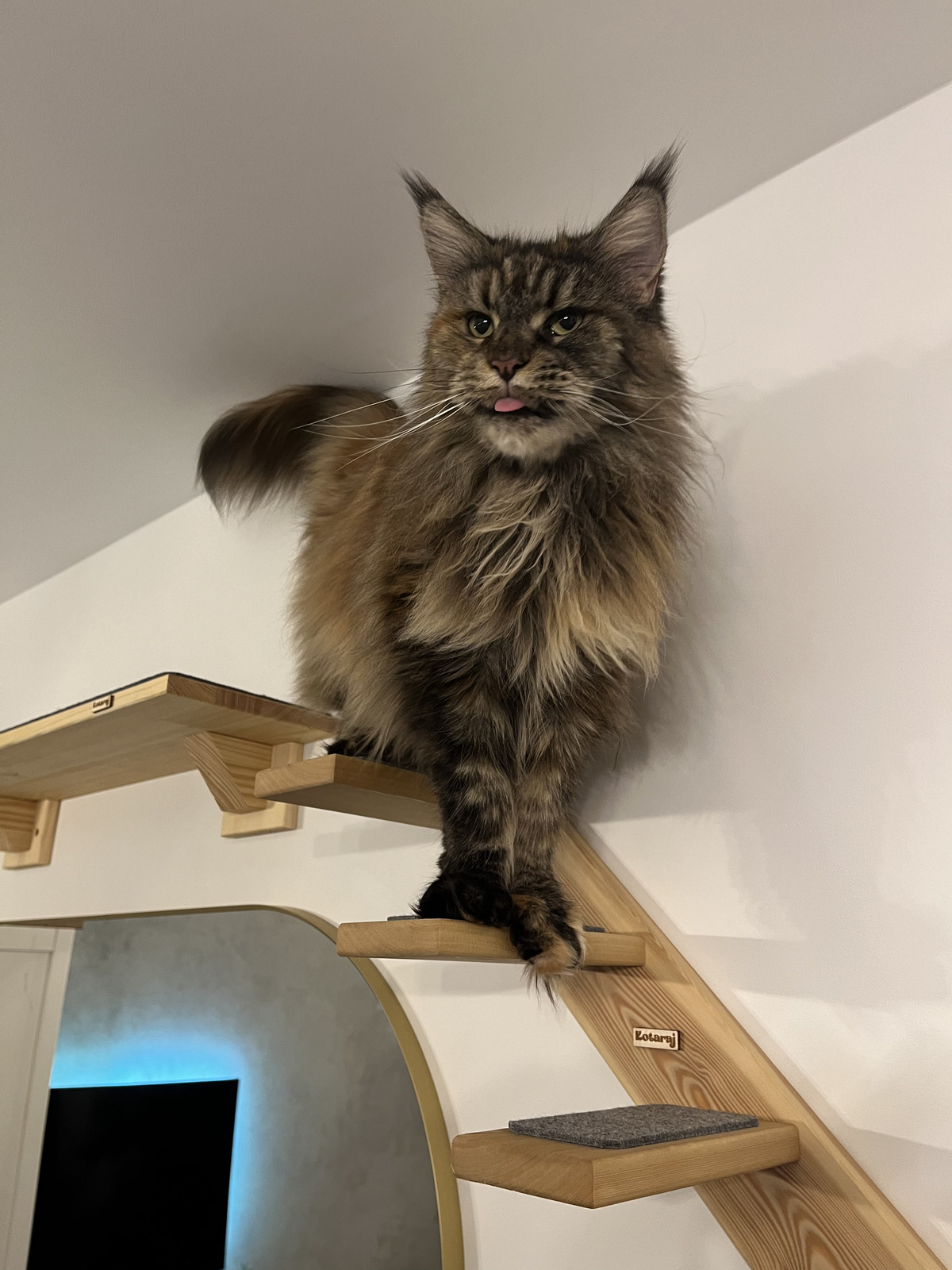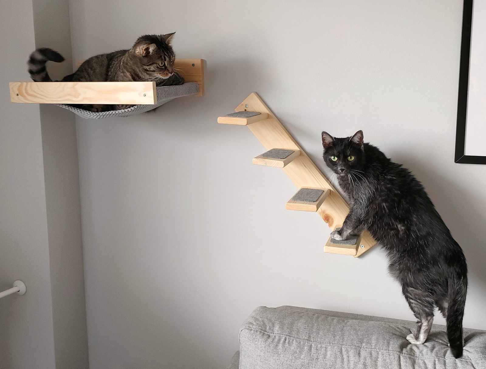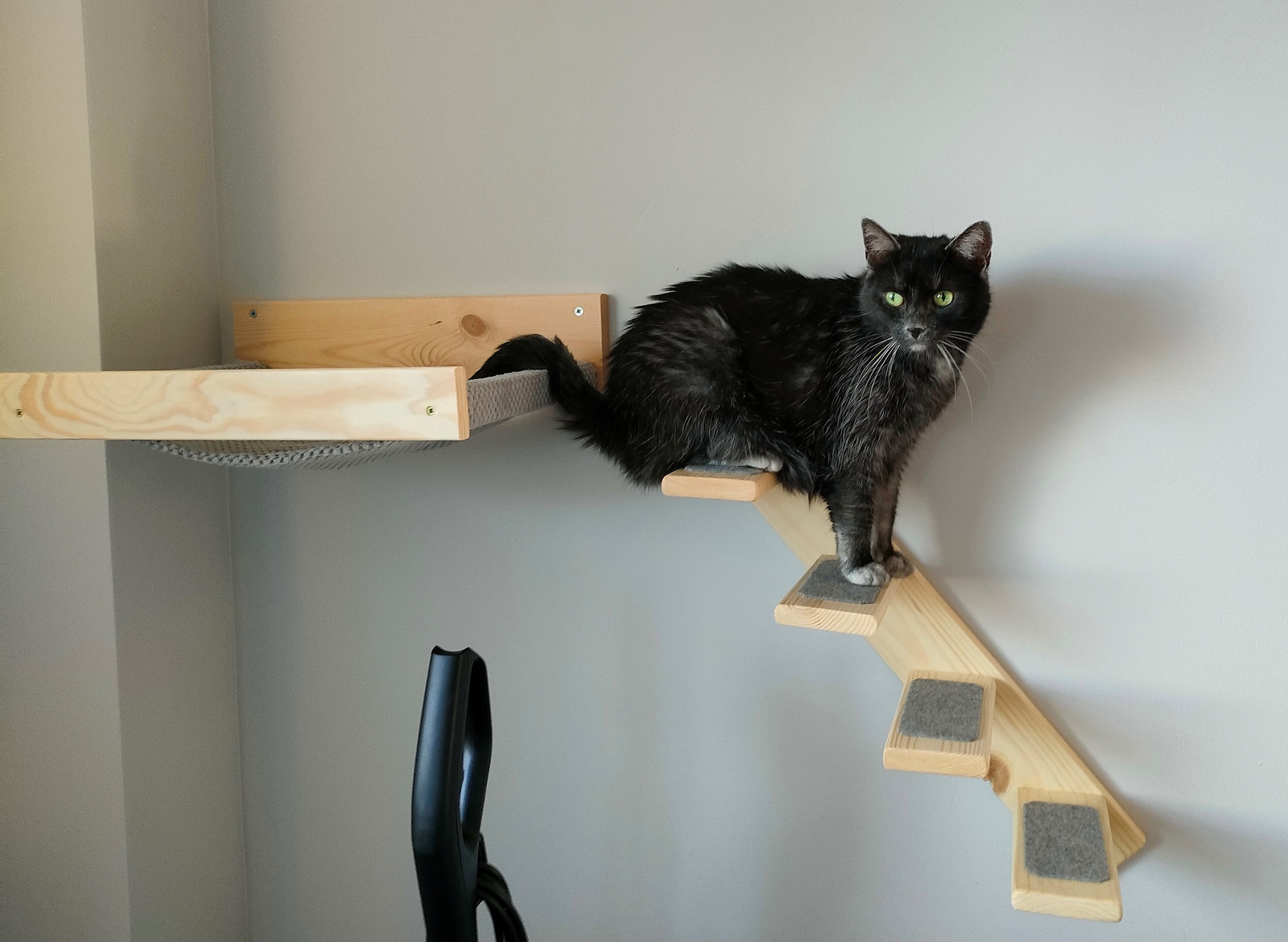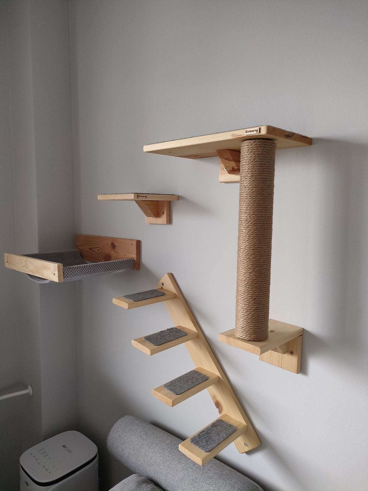 Na stopniach miękki filc w kolorze szarym daje kotu poczucie bezpieczeństwa przy największych harcach.